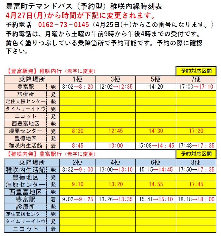 ・豊富駅から温泉間ならびに、豊富駅から稚咲内間の乗合運行バスの予約電話番号が変更になります。