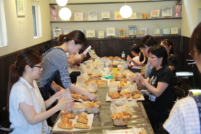 6月23日(木曜日)子育て支援センターによる『第2回育児講座「気分はパン屋さん」』がベーカリー夢工房でおこなわれました。当日は、22名の方が参加。夢工房舟根店長にパンの作り方を教えていただき、オニオンブレッドやウインナーロールなど4種類のパンをつくりました。