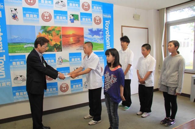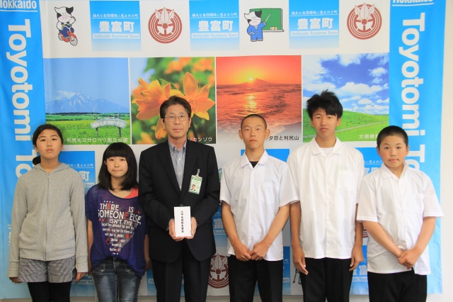 6月27日(月曜日)に児童、生徒たちは「熊本の人たちのために役立ててください」と豊富町役場を訪れ、川原副町長に寄附金が手渡されました。