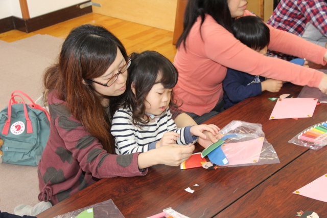 2月28日(火曜日)子育て支援センターによる「あつまれわくわくひなまつり」がおこなわれ、15組の親子が参加しました。親子でひな人形づくりをした後、ひなあられやお団子を食べ、ひなまつりを楽しみました。