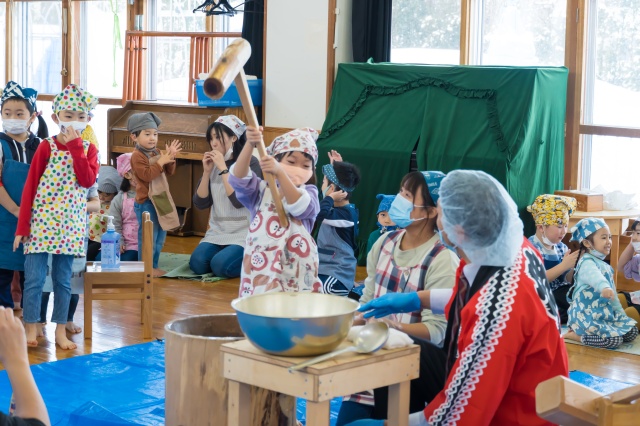 12月28日(月)保育園にて一足お先にお正月のイベント「お餅つき」がおこなわれ、園児たちは大きな木槌をもちあげて「よいしょ!よいしょ!」と元気いっぱいな掛け声とともに、力いっぱいお餅をつきました。