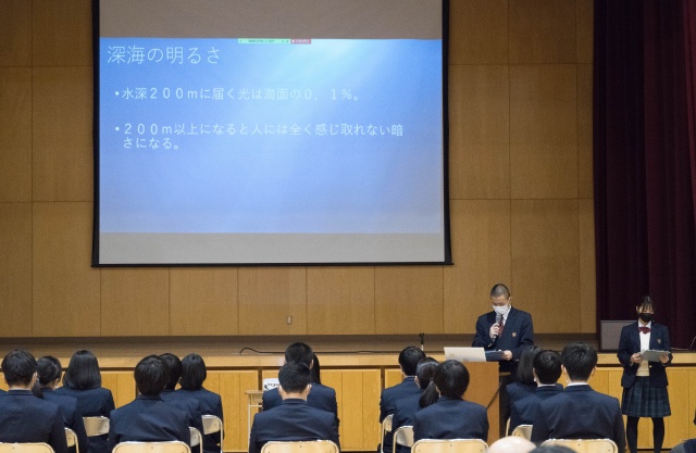 1年生は「深海について」など自分たちが考えたテーマについて、2年生は「インターンシップ」について、3年生は「3年間の地域探求」についてプレゼンテーションした後「高校生が町の大人たちから期待されていることと、私たちにできること」を題材に意見交換会がおこなわれ、生徒たちは在学中だけではなく、進学や就職したときにも自分たちに何ができるかなど真剣に考えました。